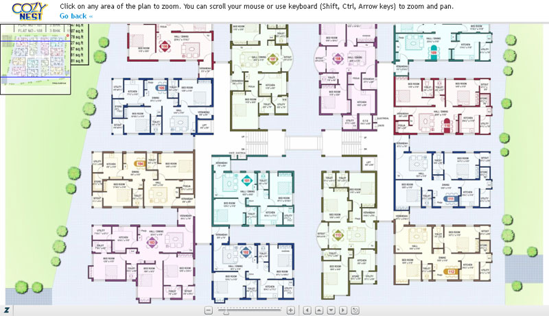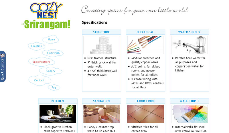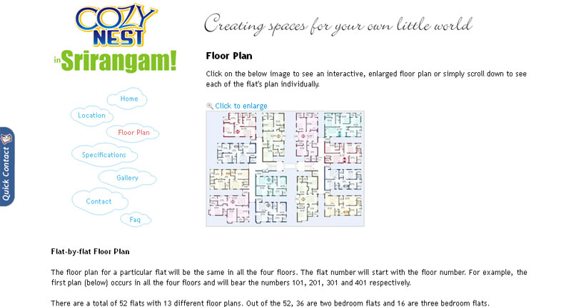 This is a business website showcasing an apartment project's features. The users can view detailed floor plans for individual flats. The entire spec of the complex is made available online for the users to consider. The object of the site is to give a comprehensive idea of the apartment complex (even when under construction) to interested buyers. The site layout and colors used highlight the features of the building in a bright and pleasant manner.
